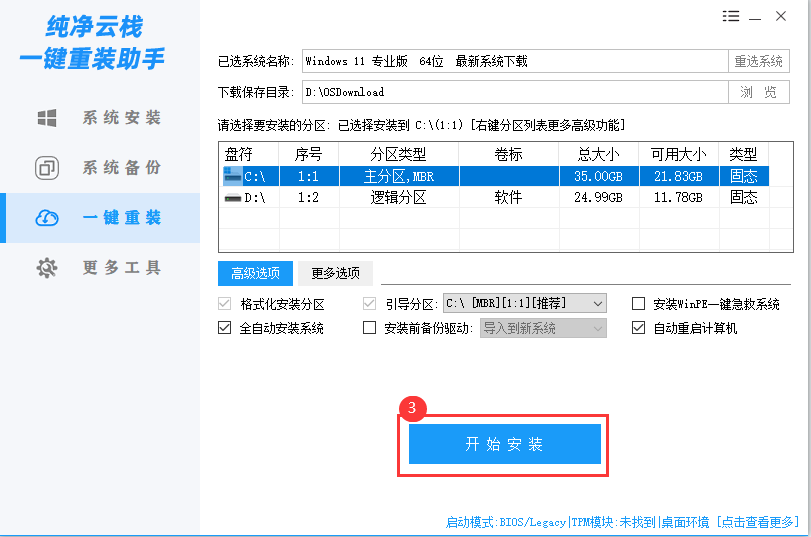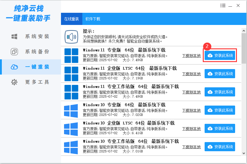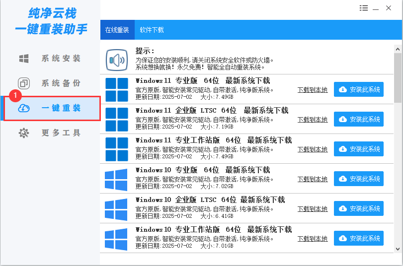 下载软件完软件后,正常打开("纯净云栈一键重装系统"),①点击【一键重装】。如下图所示