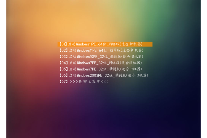 进入后,键盘↑↓键选择第一个【01】启动Windows11PE_64位_网络版(适合新机器),然后回车。(或者自行选择其它版本进入)如下图所示