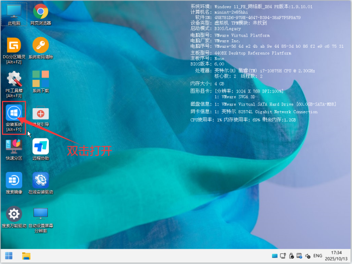 进入PE界面后,点击桌面的"安装系统"。就可以操作安装我们所需要的系统了,如下图所示
