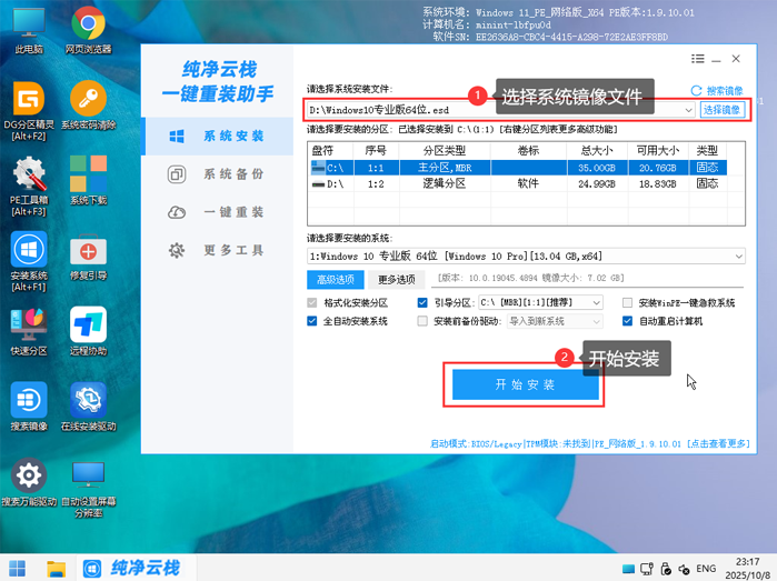 出来下图页面确认①、②、③【开始安装】。如下图所示