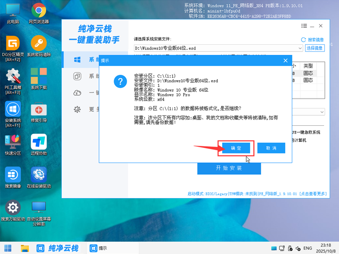在弹出的信息提示窗口中,点击"确定"进入下一步操作。注意:U盘里如果有重要文件请保存到其它地方,如下图所示